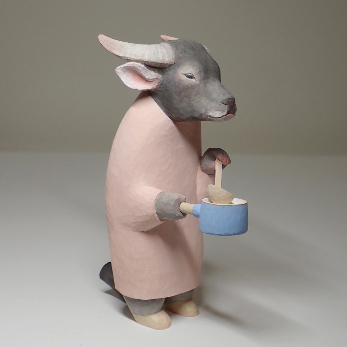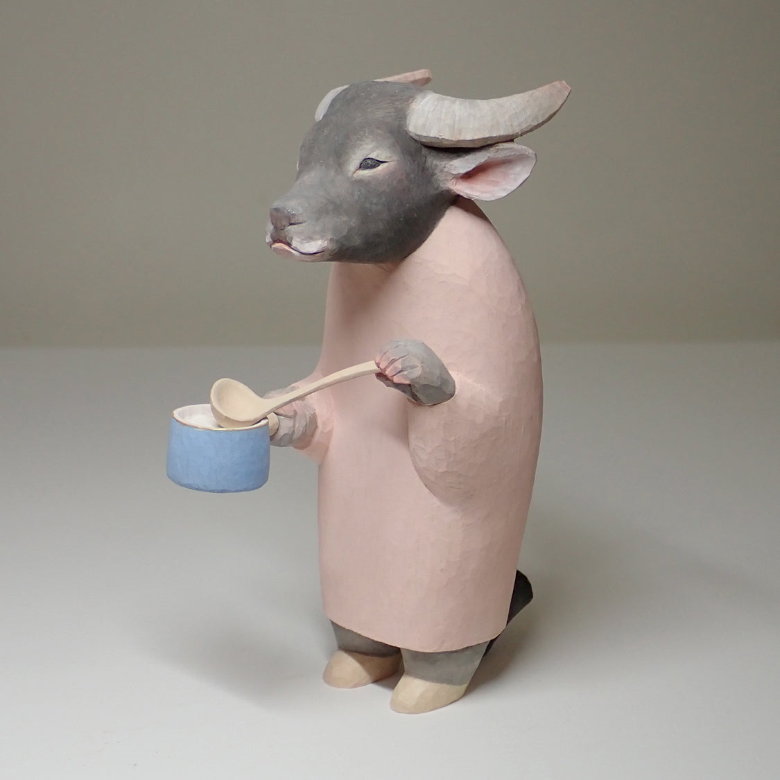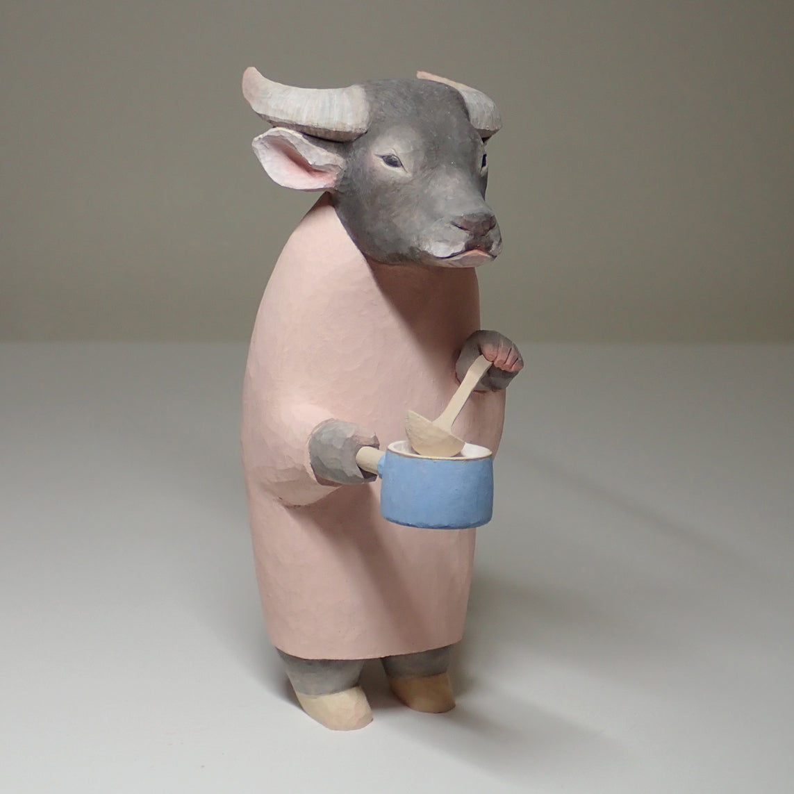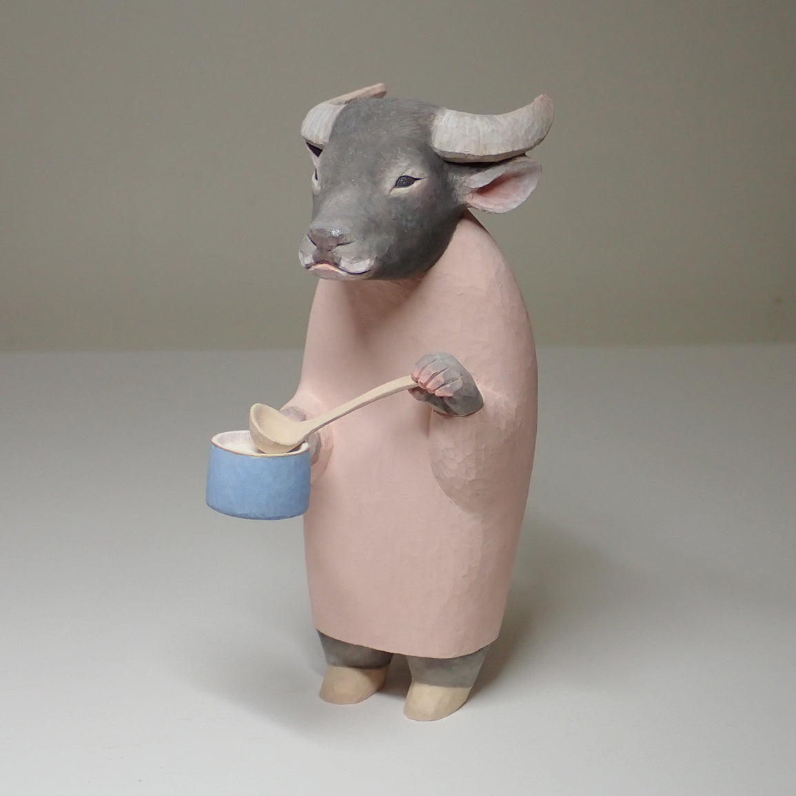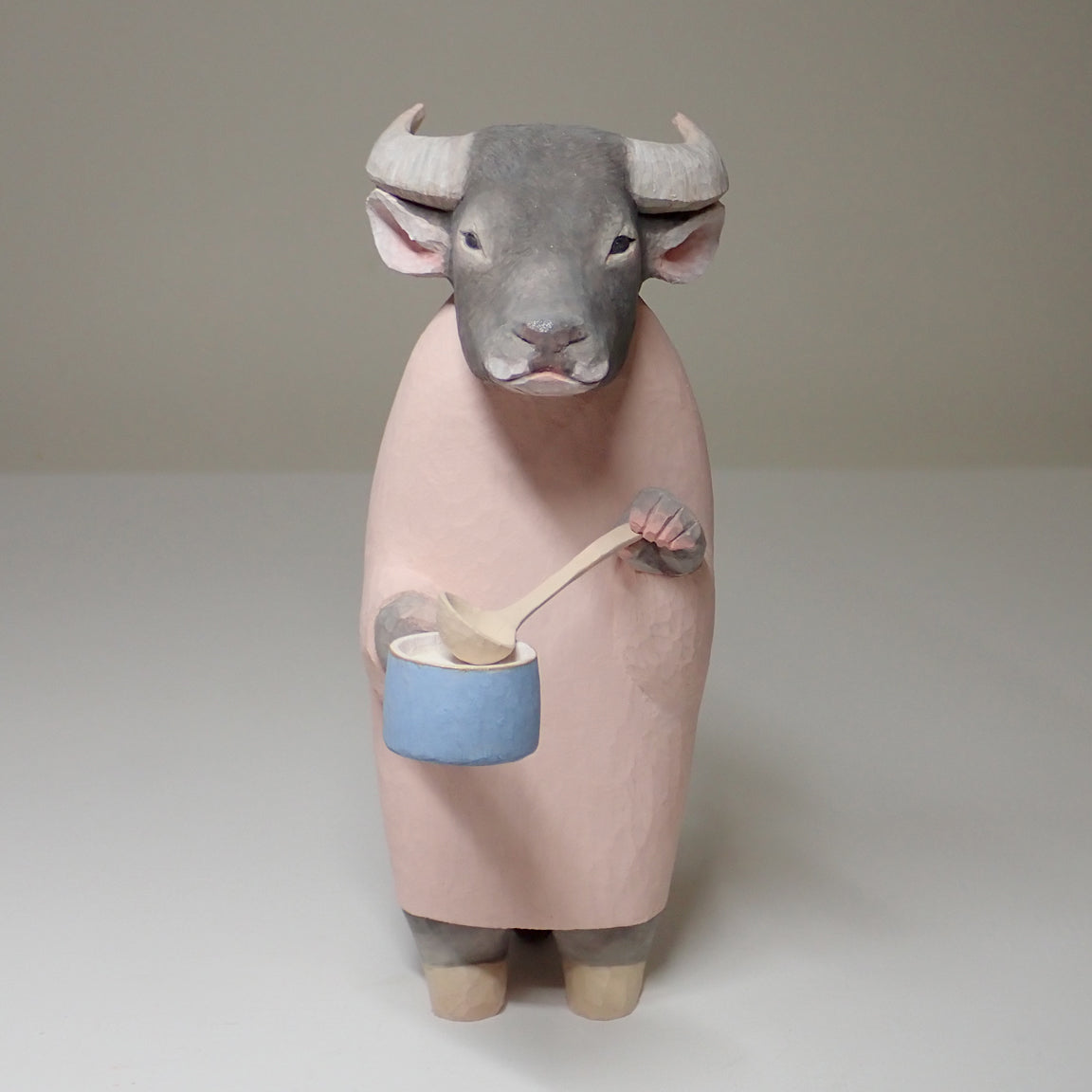 This is a wood carving of a water buffalo (Asian Suigyu).