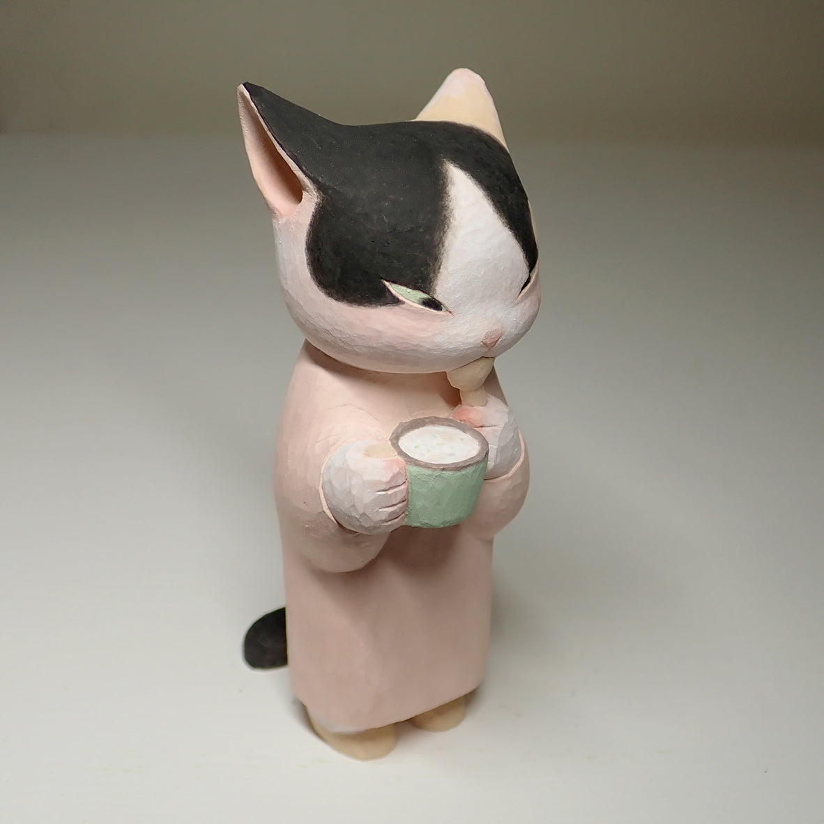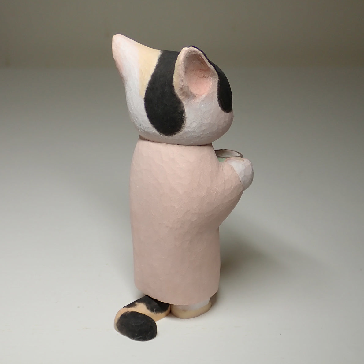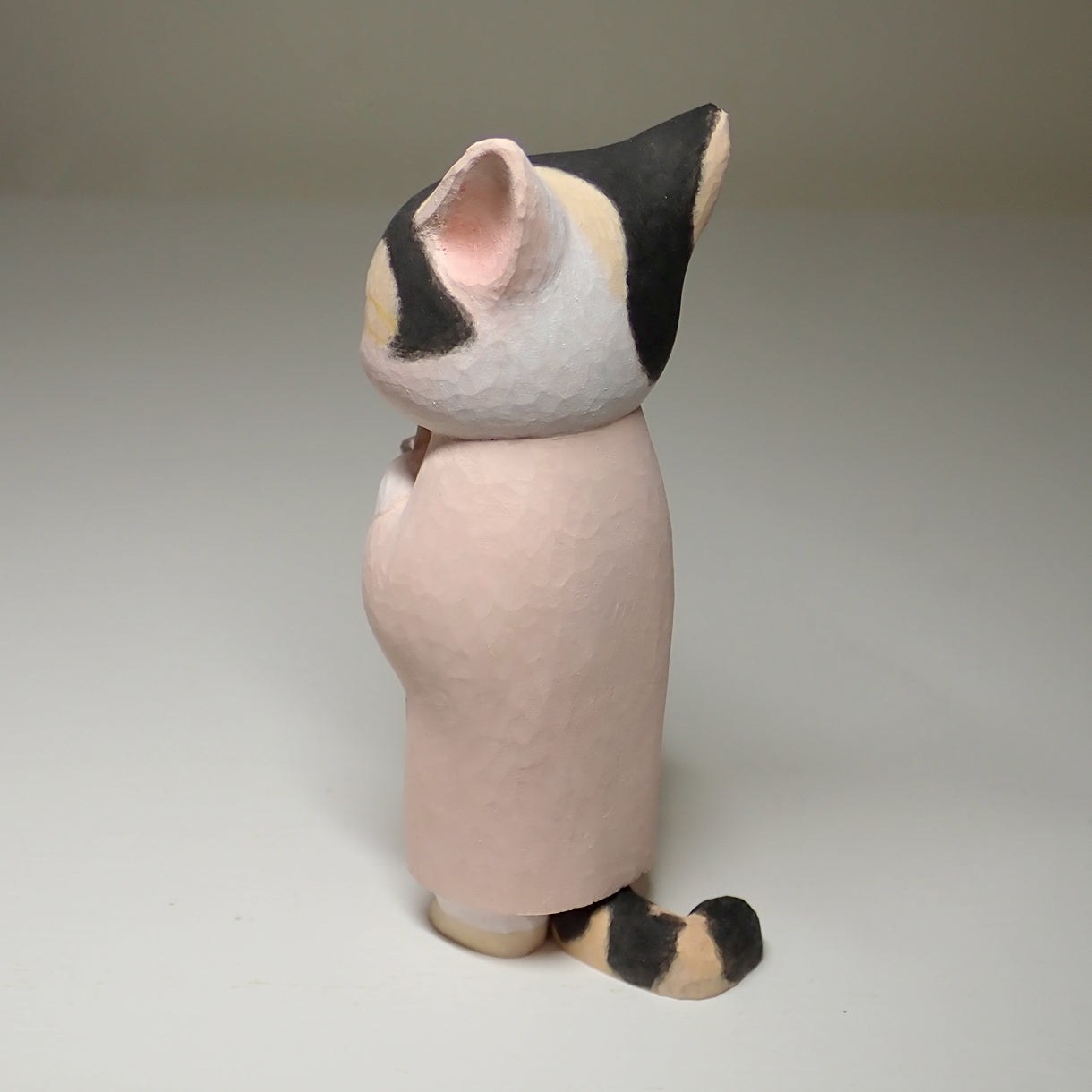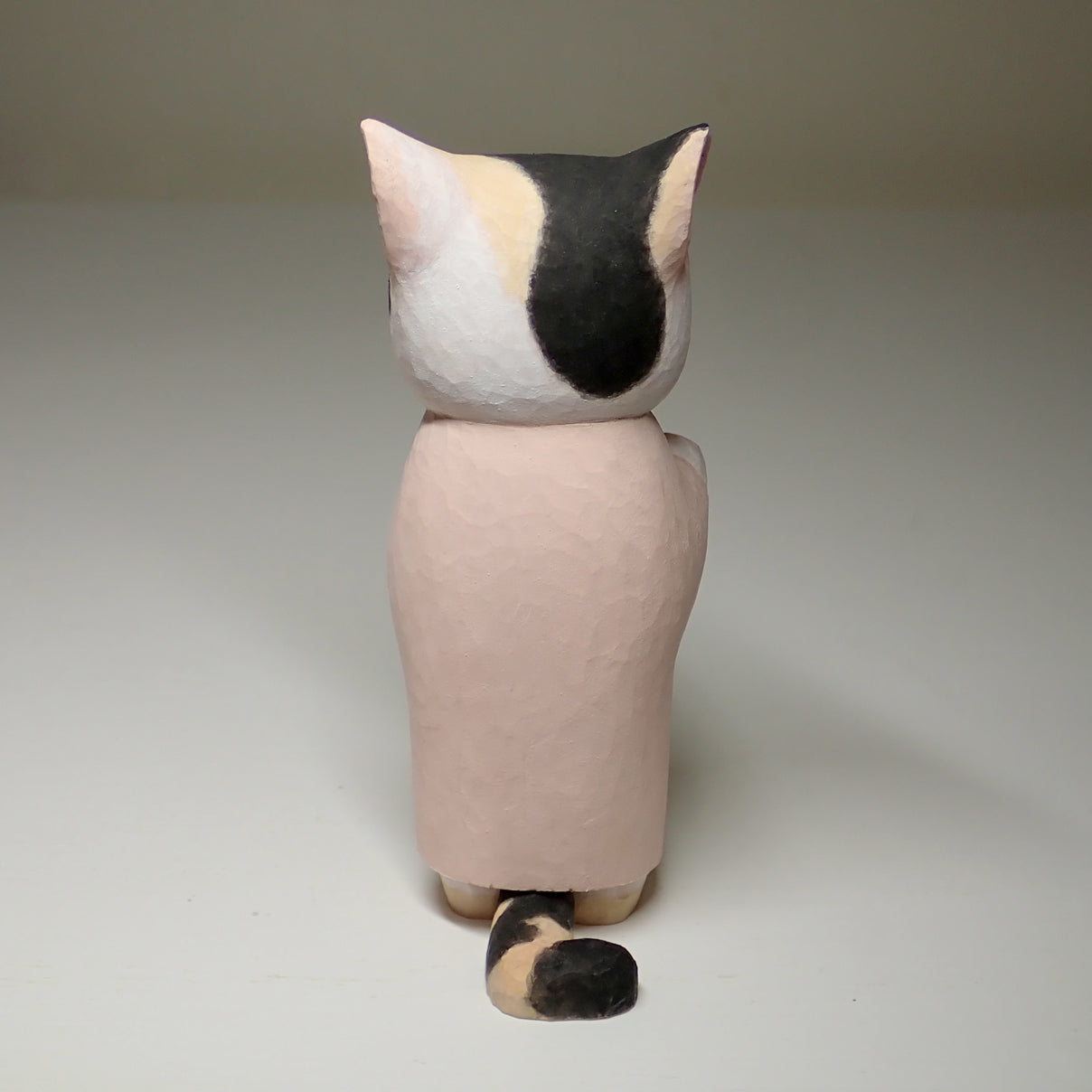 木彫りの猫(ハチワレ三毛カギ尻尾)です。