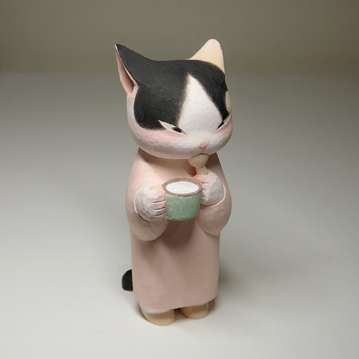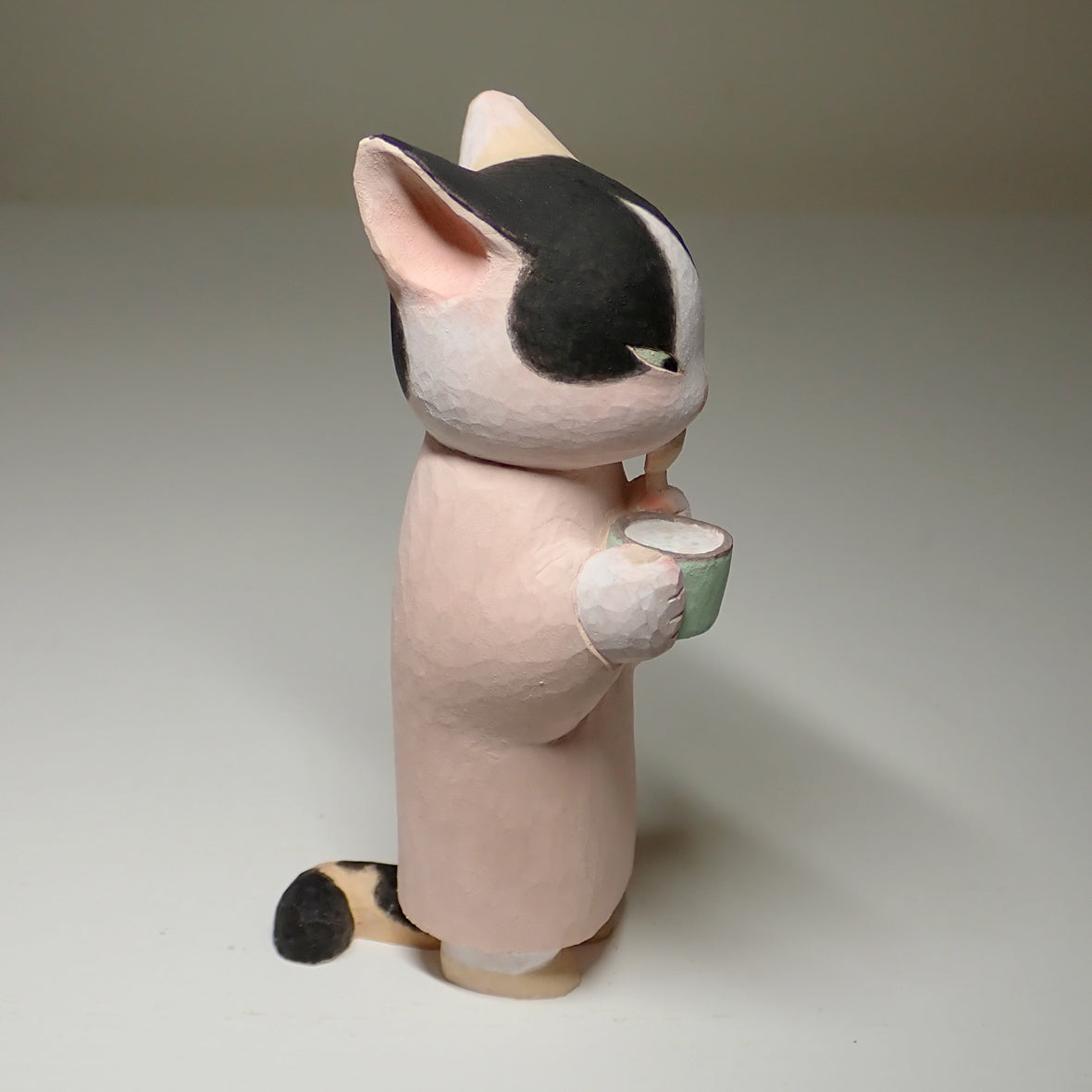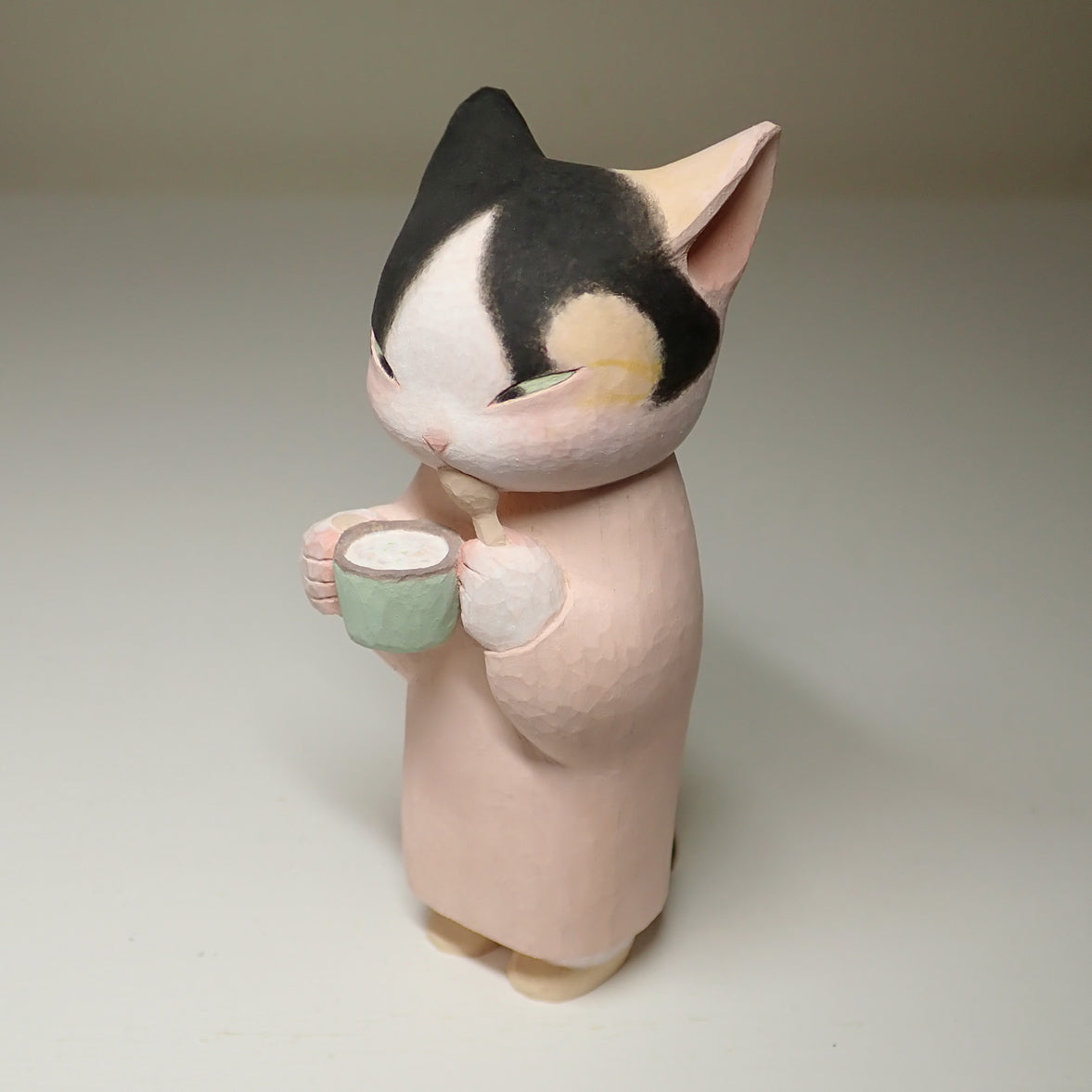 木彫りの猫(ハチワレ三毛カギ尻尾)です。