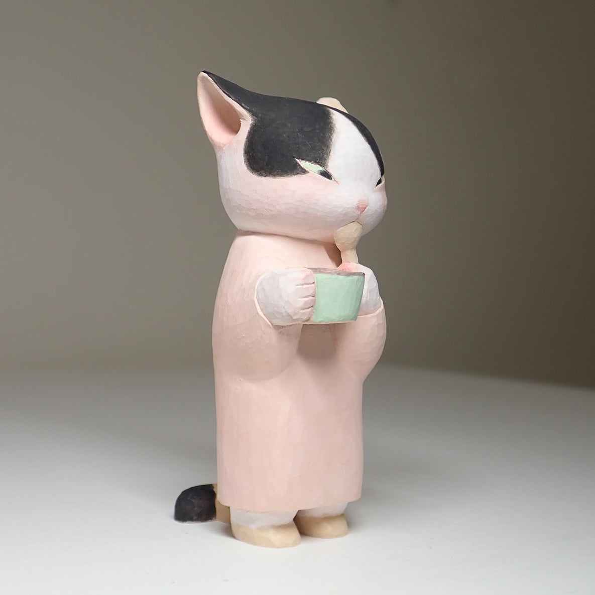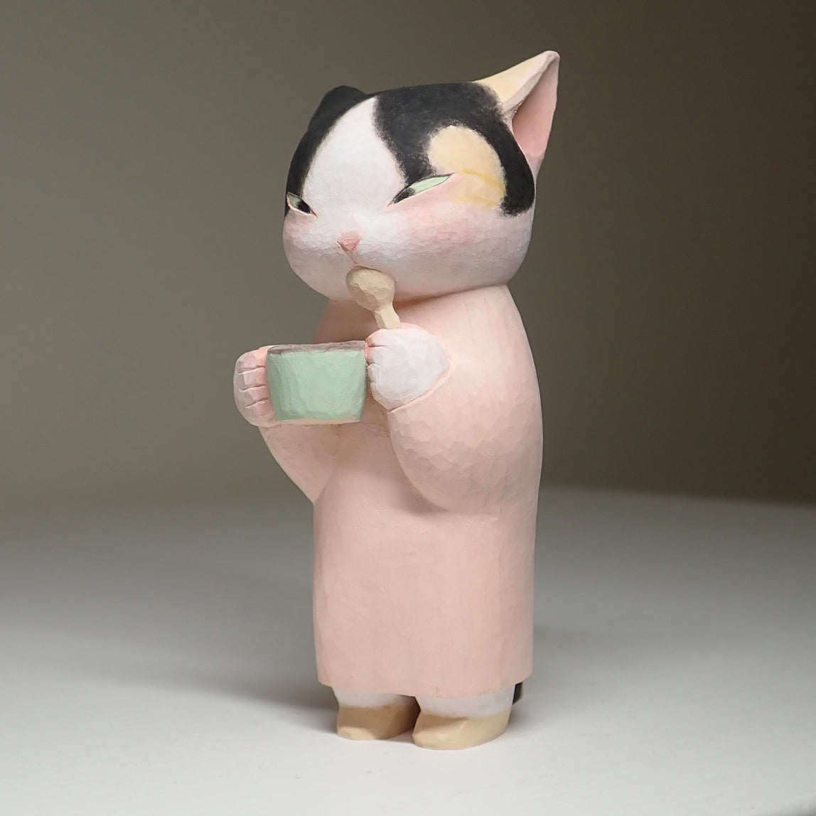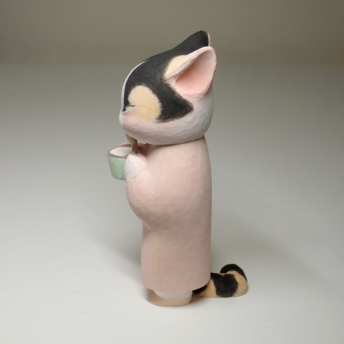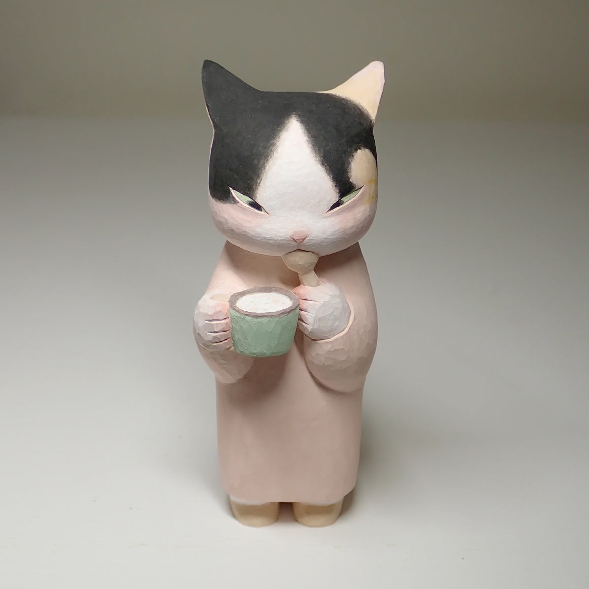 木彫りの猫(ハチワレ三毛カギ尻尾)です。